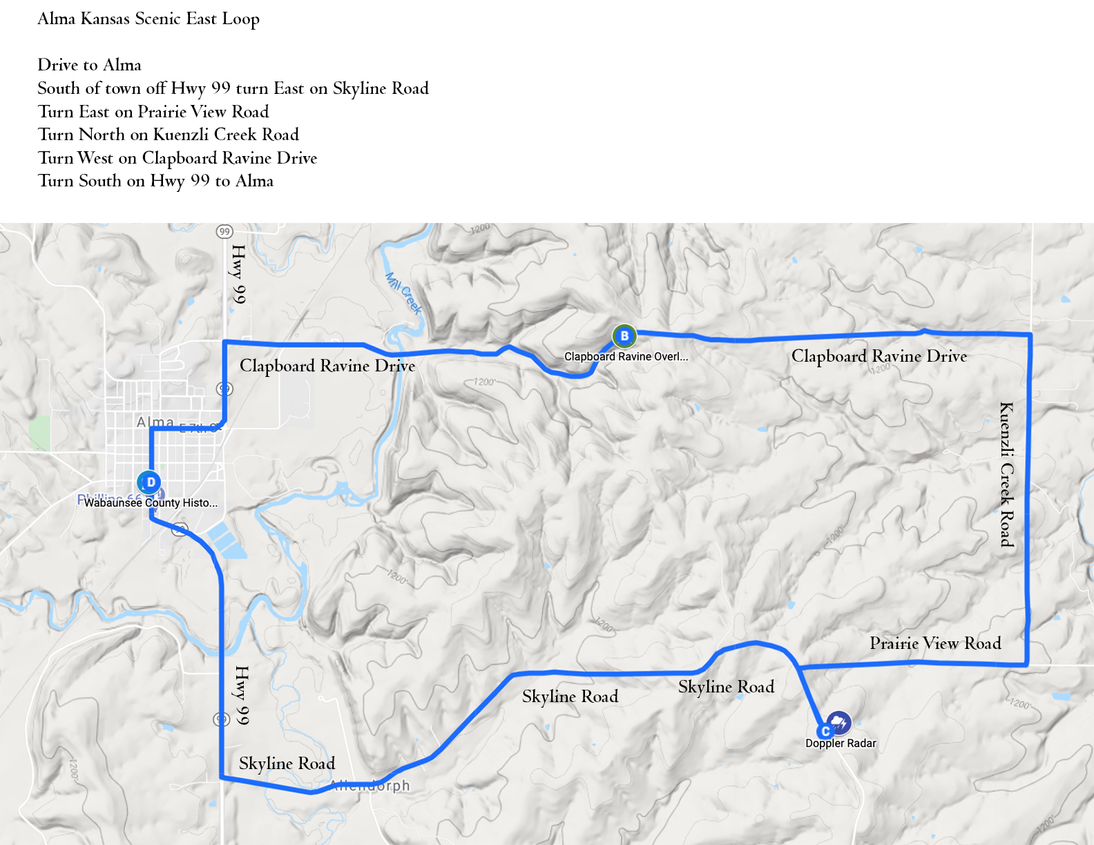 Enjoy this scenic drive of the Flint Hills at your own pace. In Alma be sure to visit the Wabaunsee County Historical Society Museum to see their exhibit