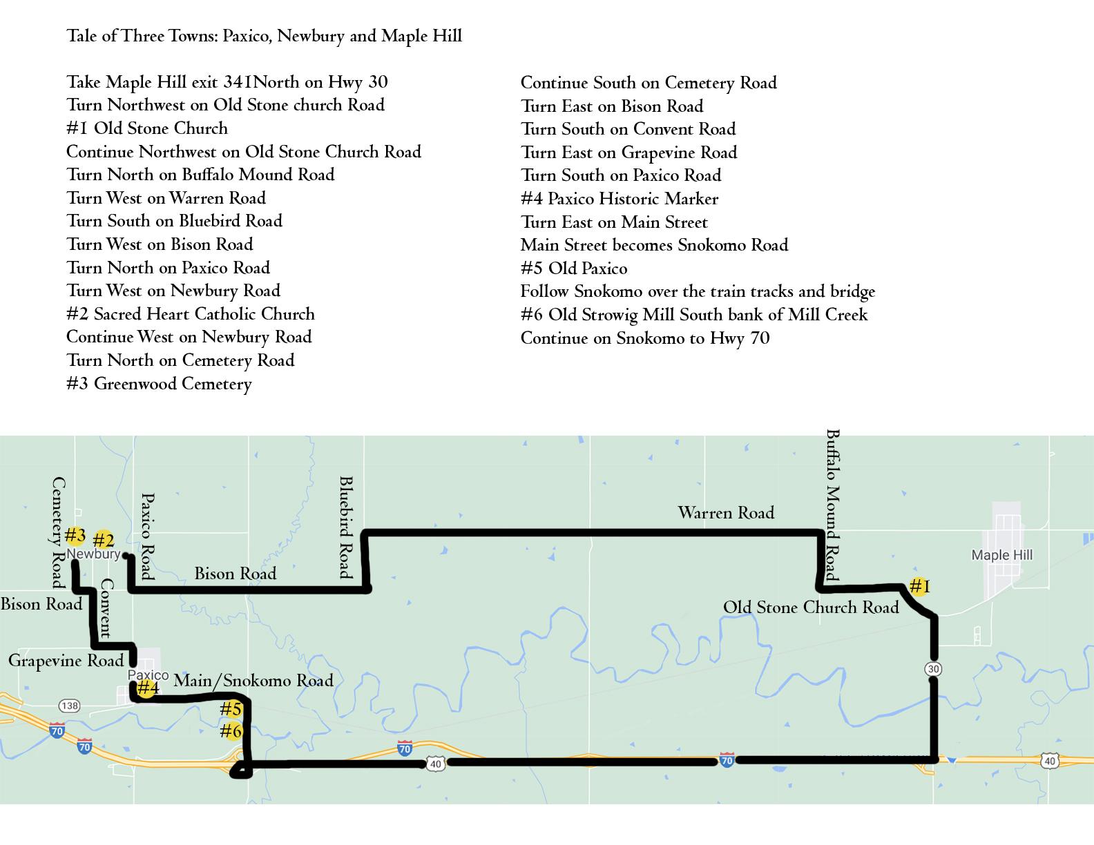 Explore Paxico, Newbury and the historic site of “Old Paxico”. The google map describes the tales of how a railroad could make or break a small town by the placement of the depot. Newbury and “Old Paxico” both lobbied for the opportunity to host the depot. The railroad company ended up placing the depot between the towns. “Old Paxico” jumped at the chance and moved the townsite a mile west, near Mill Creek, next to the newly constructed depot. “Tale of Three Towns” written by Doug Heigert is on file at the Wabaunsee County Historical Society. Stop in to learn the whole store. We hope you enjoy your drive!